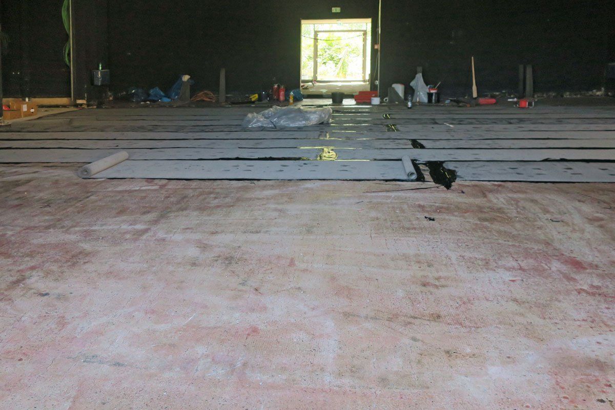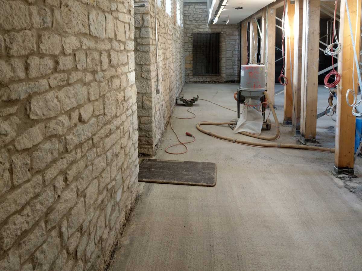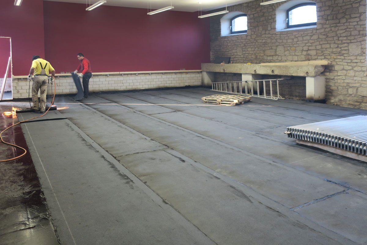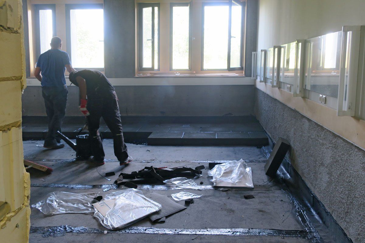 Die eigentlichen Arbeiten zur Wiederherstellung des Bodenbelags starteten im Februar 2018. Auf dem bearbeiteten Untergrund wurde eine Lage Polymerbitumen-Dachdichtungsbahn in heißflüssiger Bitumenklebemasse aufbracht. Darauf erfolgte das Verlegen der Schaumglas-Dämmung in Heißbitumen. Um die Dämmplatten wasserdicht und auftriebssicher herzustellen, wurde die Abdichtungsebene zugfest auf der Bodenplatte verlegt und an den Wänden hochgeführt. Es folgte das Aufbringen einer weiteren bituminösen Abdichtung in Kombination mit einer Mastixschicht. An aufgehenden Bauteilen wurde zusätzlich eine mineralische Schlämme bis zu einer Höhe von 70 Zentimetern aufgetragen. Die obere Abdichtungsebene bildet schließlich den Untergrund für zwei Schichten Gussasphaltestrich. Durch mehrmaliges Abschleifen und Versiegeln wurde die obere Lage zu einem Terrazzoboden verarbeitet.