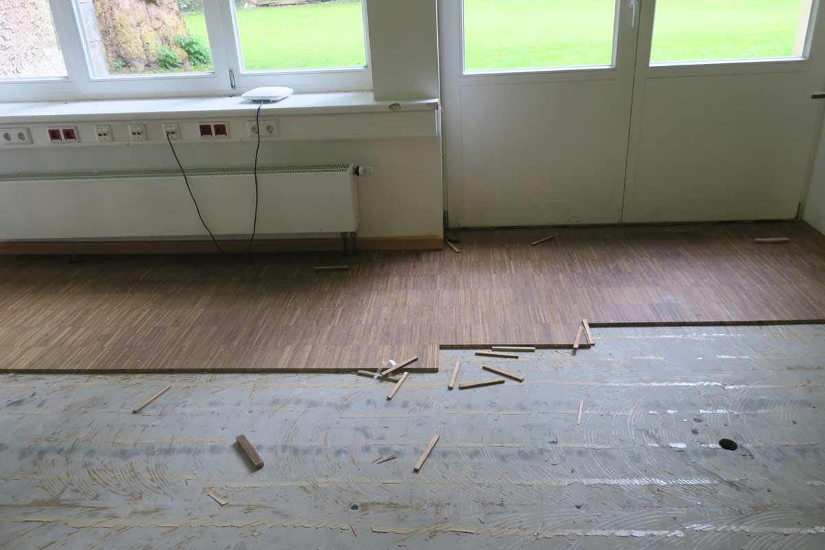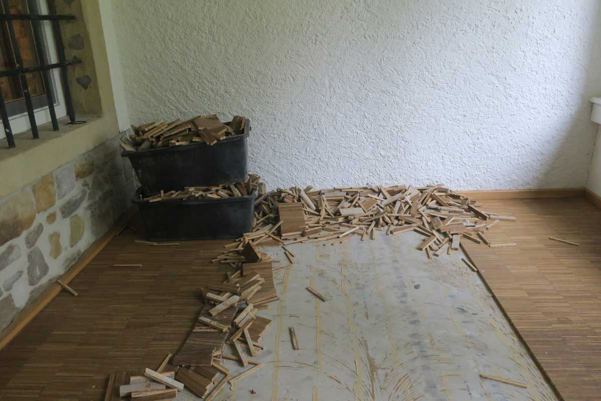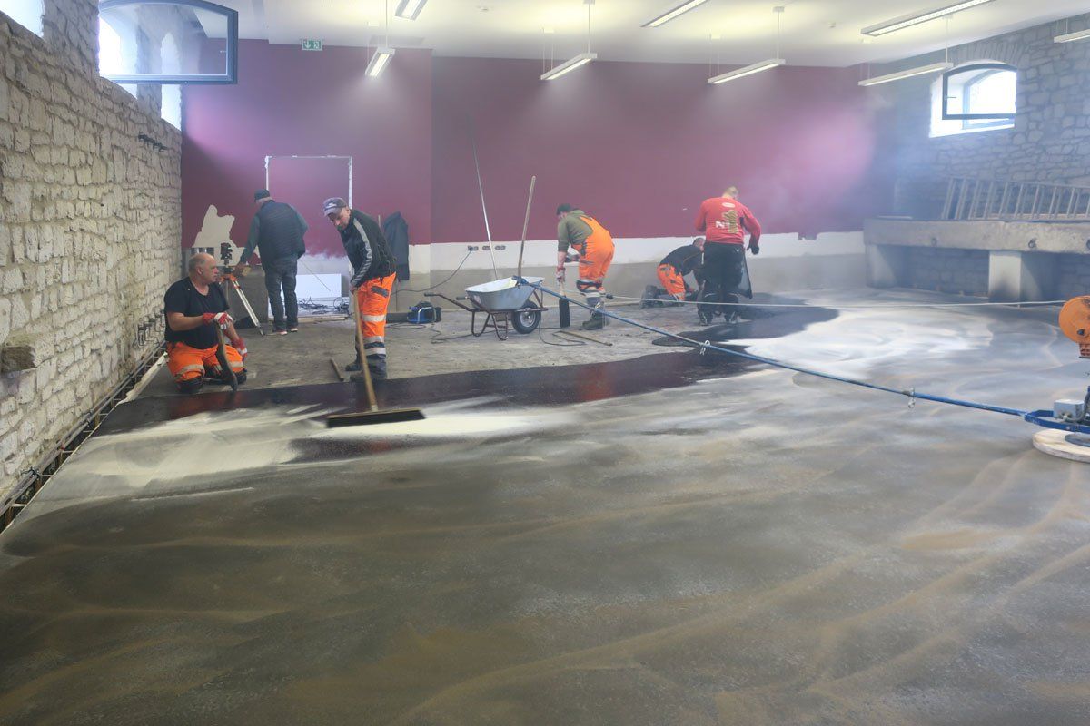 Im Zuge der Starkregenereignisse des Sommers 2017 wurde das Erdgeschoss des Kulturkampus Domäne Marienburg überflutet. Der vorhandene Belag, bestehend aus einer EPS-Dämmung, einem Zementestrich und einem Parkettbelag, wurde dadurch so beschädigt, dass er komplett abgerissen werden musste.